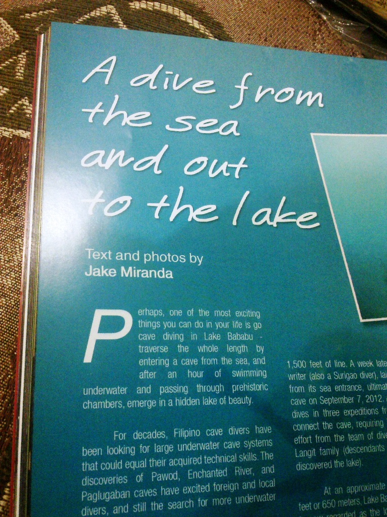 Our article on Lake Bababu is featured in the latest issue of M magazine, Life & Living in Mindanao. It gets front-billing on the cover. This may be the first time that a national magazine has featured cave diving. We appreciate the big boost Mr. Editor. Thank you! Get your copies now!