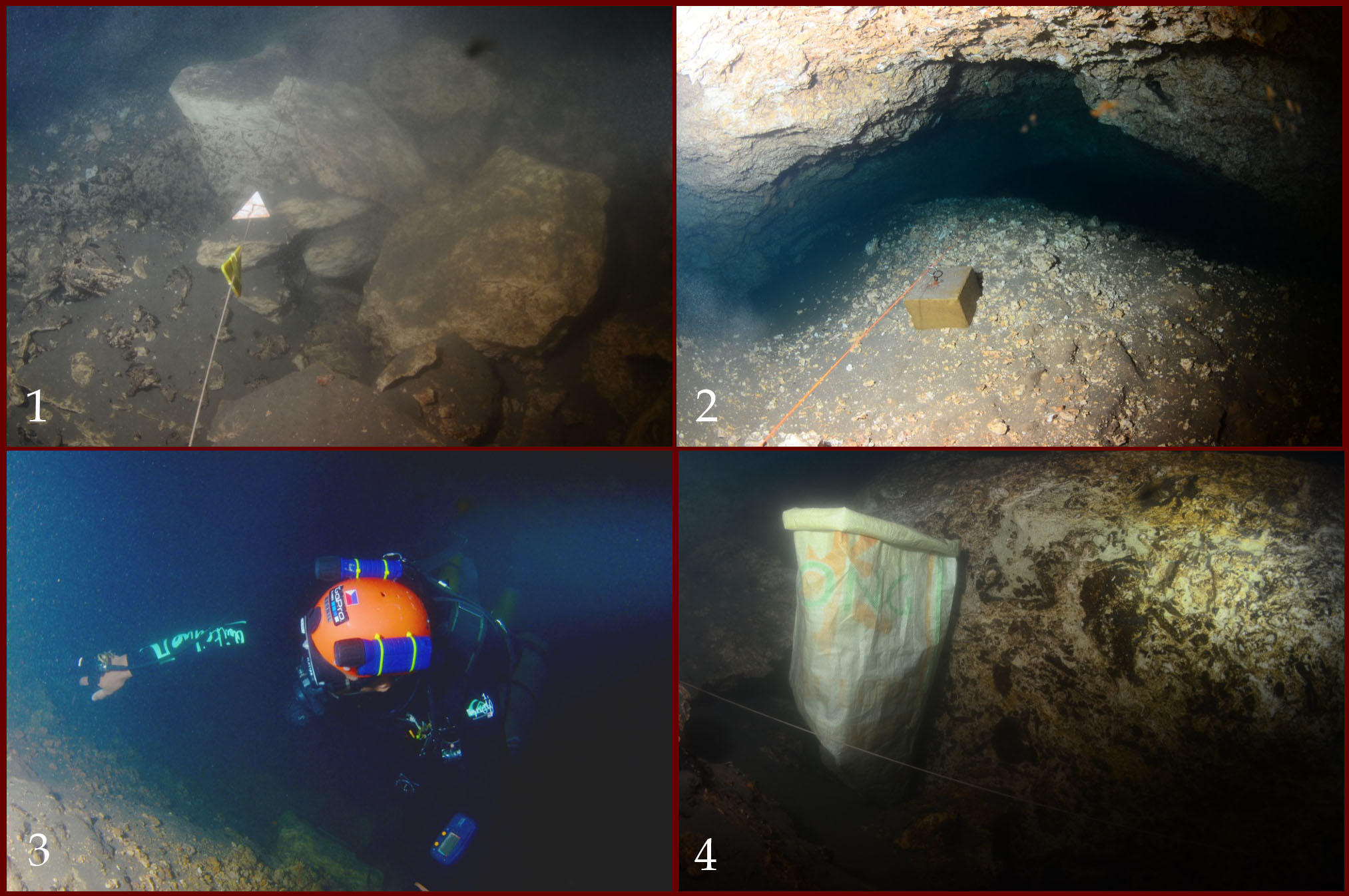 2. Concrete blocks. Unscrupulous divers installed many of these concrete blocks without permission. The process of installing them probably contributed to significant erosion changes where fresh limestone dislodgement of various sizes are noted on the floor. At the very least, the presence of the blocks has destroyed the natural ambience of the cave.