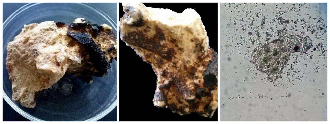- Organics: Microscopic green algae present, as well as spiral-shaped cyanobacteria. Cells disintegrated due to crushing
