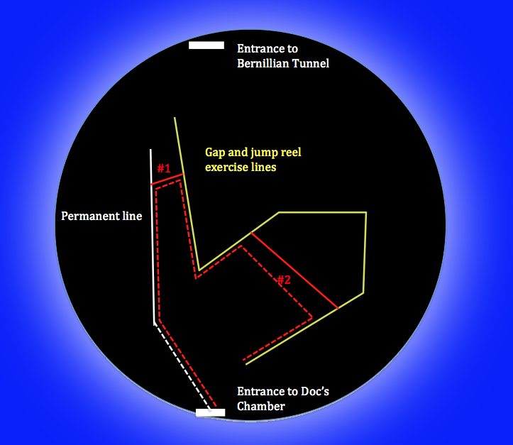 Typical of any weekend, the spring pool at Pawod was teeming with kids swimming and jumping from the surrounding cliffs and overhanging tree branches. This means only one thing – zero-viz. And zero-viz it was at the spring pool and down to the first couple of meters inside the chamber. We therefore scrapped the first plan of primary tie-off down the permanent line, in which stead, I laid a temporary line from open water down to the start of the white permanent line. This segment turned out to be the more difficult part of the dive for the team. Jaime commented to Andy that it was no problem getting in at all – “just like in the pool”. Yes, the team spent nights in Doc’s swimming pool doing line following, reel exercises and emergencies.