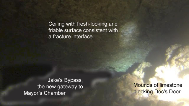 Fig 3 below is a picture grabbed from the video showing the mound of limestone right above what was Doc’s Door. Examination of the ceiling showed fresh-looking edges with friable and relatively loose limestone.