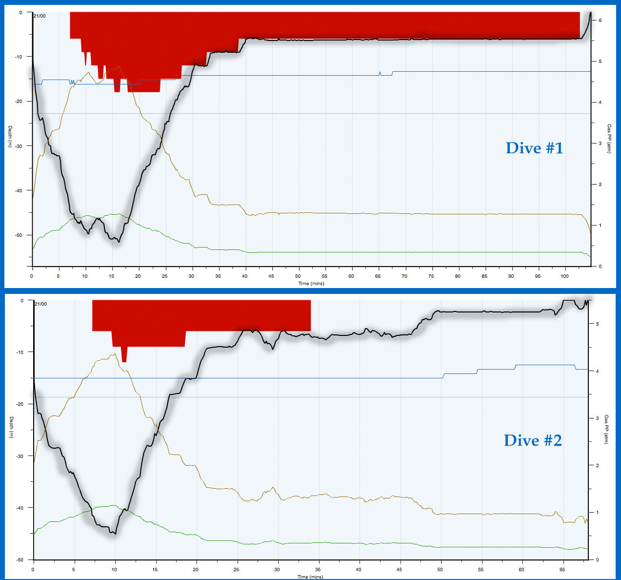 Dive #2 was done at the middle portion of the tide chart upstroke expecting a good visibility throughout for video and photographic documentation of the cave in source. It was the best ever condition – no current, unlimited visibility – which this author has ever experienced in five trips to Hinatuan Enchanted River. Fig 2 below shows the dive profiles of the two dives uploaded from the team’s Shearwater Petrel computer.