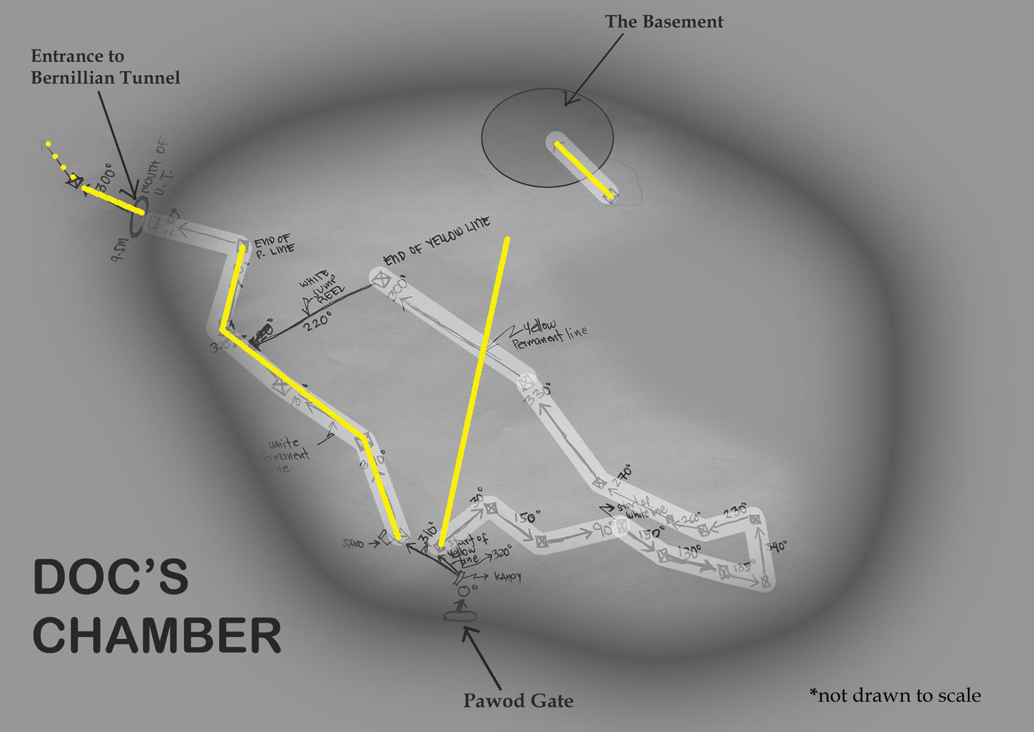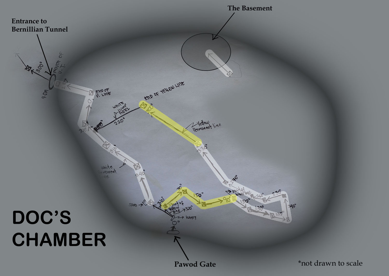Figure 2 below shows the final permanent lines (in yellow). These include the two lines in Doc’s Chamber, the short line going to the Basement, and the line in Bernillian Tunnel.