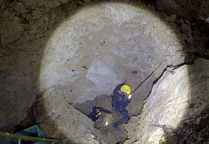 Access to the bottom of the first part of the cave was made possible by bamboo ladders constructed on the spot from bamboos and trees chopped down in the area.
