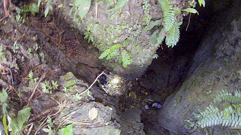 The crown jewel of the FCD Siargao Expedition of April 2014 is the discovery of The Inner Sanctum of Del Carmen. It is a forbidden cave in the foothills near the center of Barangay Tuboran, Del Carmen, Siargao Island. Reportedly nobody has gone inside the cave before this expedition because of the unworldly inhabitants inside – a story handed down for generations. Figure 1 below shows the V-shaped crack on the ground that leads down to a landing about 4 meters below.