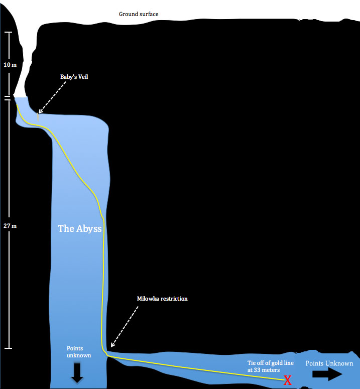 Fig 4. Baby’s veil are water roots decorating the entrance to The Abyss, a huge chimney that drops straight down to points unknown. At about 27 meters, Milowka’s restriction, a narrow diagonal crack that leads to passageways and chambers of unknown dimension and extent, was encountered.