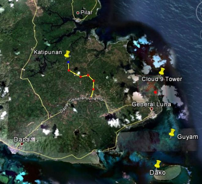 The spring is located 500 meters southwest of Barangay Katipunan, Pilar municipality, on the island of Siargao, Surigao del Norte, Philippines (9°49’41.99″N, 126° 5’24.15″E). It feeds a small river that meanders for 4.5 kilometers along embankments of Nipa and mangrove trees, finally flushing out to sea at the eastern part of Siargao Island. The barangay (population 600+), is accessible through the Corazon junction in the middle of the Dapa-General Luna road. The junction is 8 kilometers from Dapa, and only 7 kilometers from General Luna.